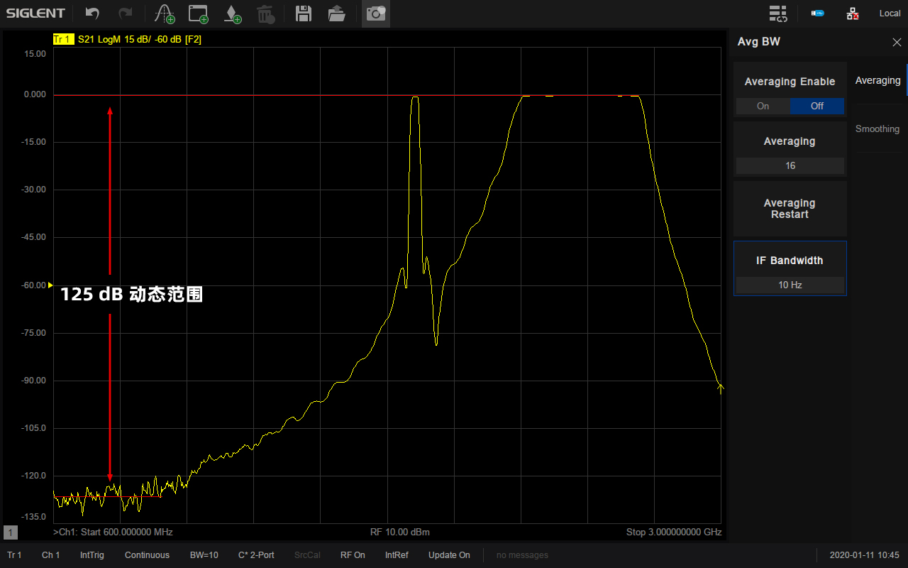 系统动态范围是VNA一个非常重要的指标,它是VNA源的最大输出功率与测试端口本底噪声的差值。SNA5000X的动态范围可达125dB@10Hz IFBW,接收机噪底-125 dBm/Hz,可适用于对动态范围要求比较高的测试场景,比如同时测量滤波器的通带和带外抑制性能。
