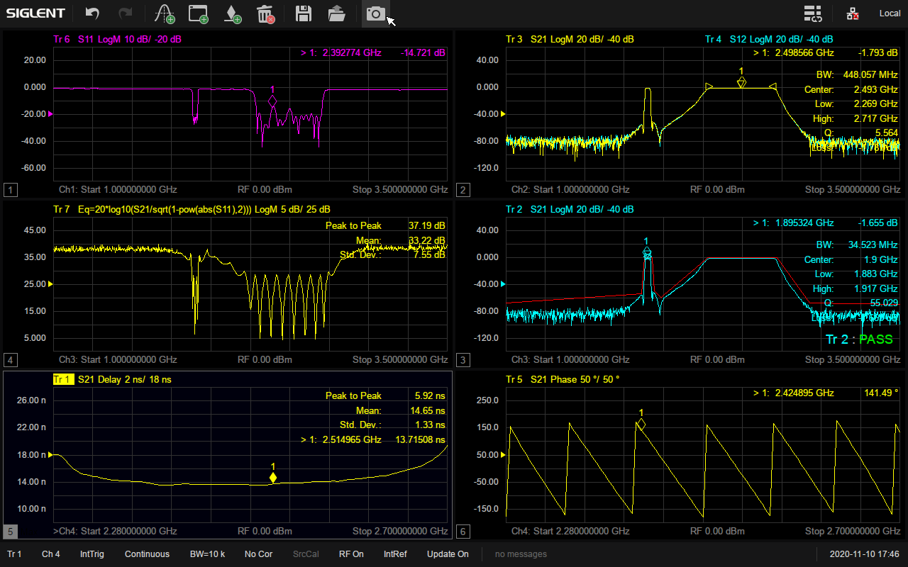 SNA5000X系列支持在多个窗口添加多条迹线进行全4端口S参数测试,并且具备多种显示格式,比如Log Mag,Lin Mag,Smith,Phase,Delay,Smith,SWR,Polar等,可以方便快捷地分析被测物的传输系数,反射系数,驻波比,阻抗匹配,相位,延时等参数。在生产线验证天线,滤波器等的特性时,还可以保存参考迹线或者添加Limit模板进行通过失败测试,有利于提高生产效率。