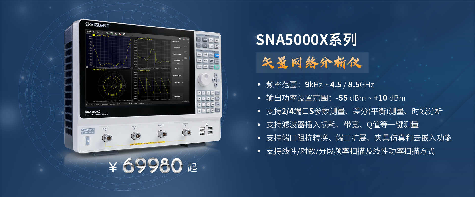 SNA5000X系列包含SNA5052X, SNA5082X, SNA5054X,SNA5084X共4个型号,测量频率范围涵盖9kHz~4.5GHz/8.5GHz,支持2端口和4端口S参数测量,具备12.1英寸触摸屏,支持外接鼠标键盘操作,拥有友好的人机交互界面。相比传统的矢量网络分析仪,体积更小,重量更轻,为客户节省了大量的实验室及生产线空间。SNA5000X系列矢量网络分析仪凭借其丰富的功能及优秀的交互体验,广泛适用于公司研发,生产制造,研究院所等场景。
